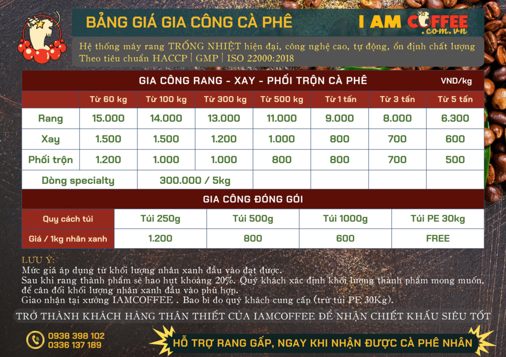 - Giá không bao gồm các phí: hạt cà phê xanh, xay, phối trộn, VAT, bao bì, vận chuyển và xuất khẩu.